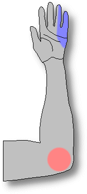 corner of the nerve as makes the bend around the elbow. Hitting the elbow