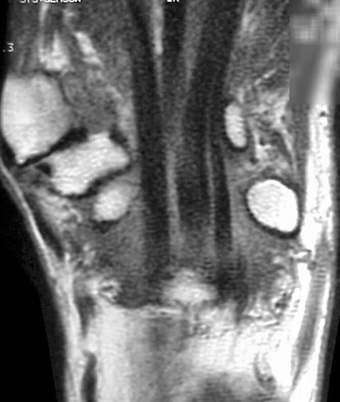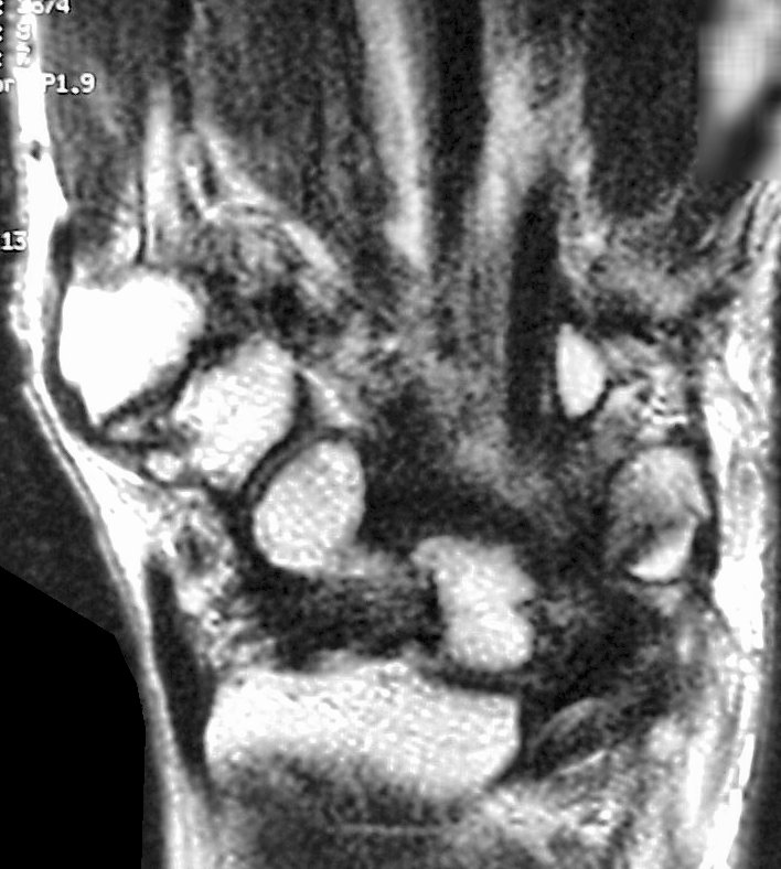 two common patterns. Protruding osteophytes of the radius, scaphoid or